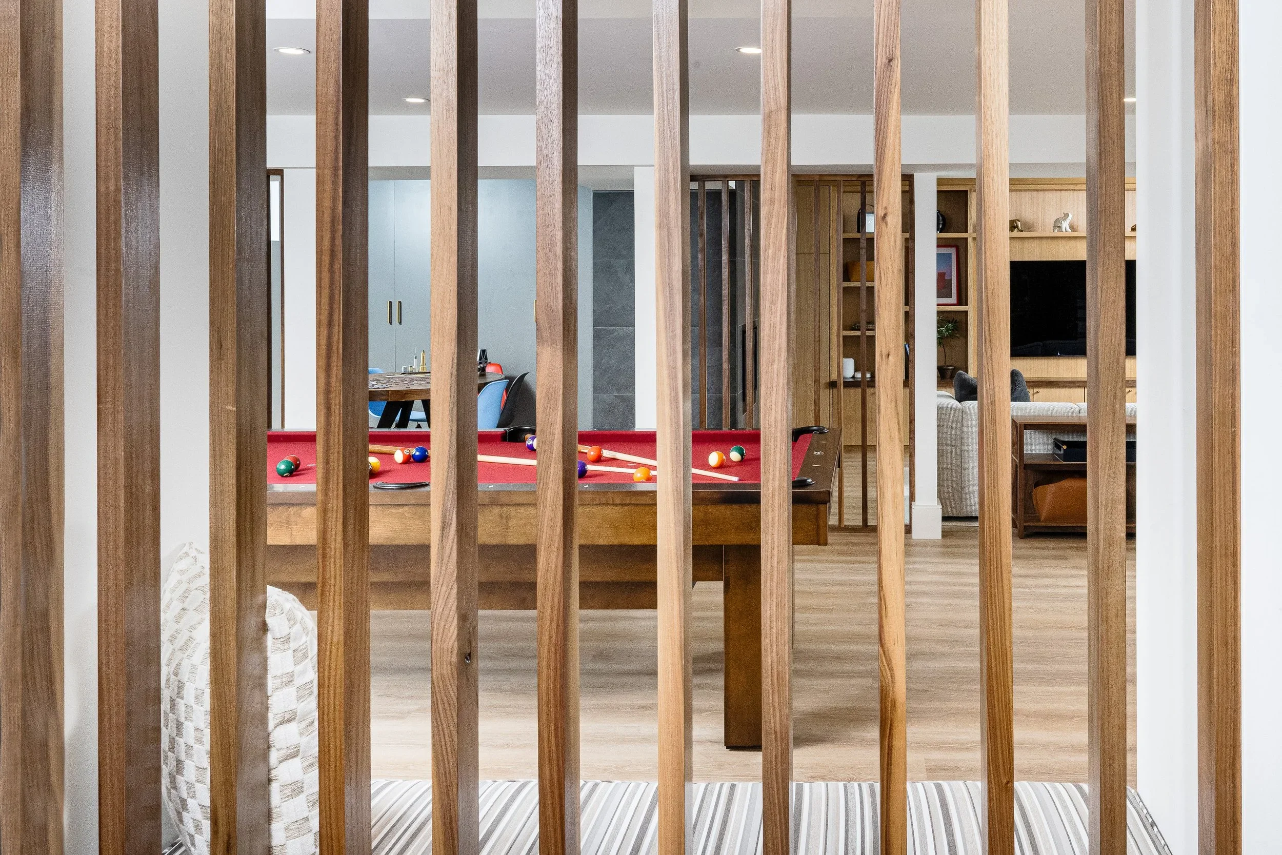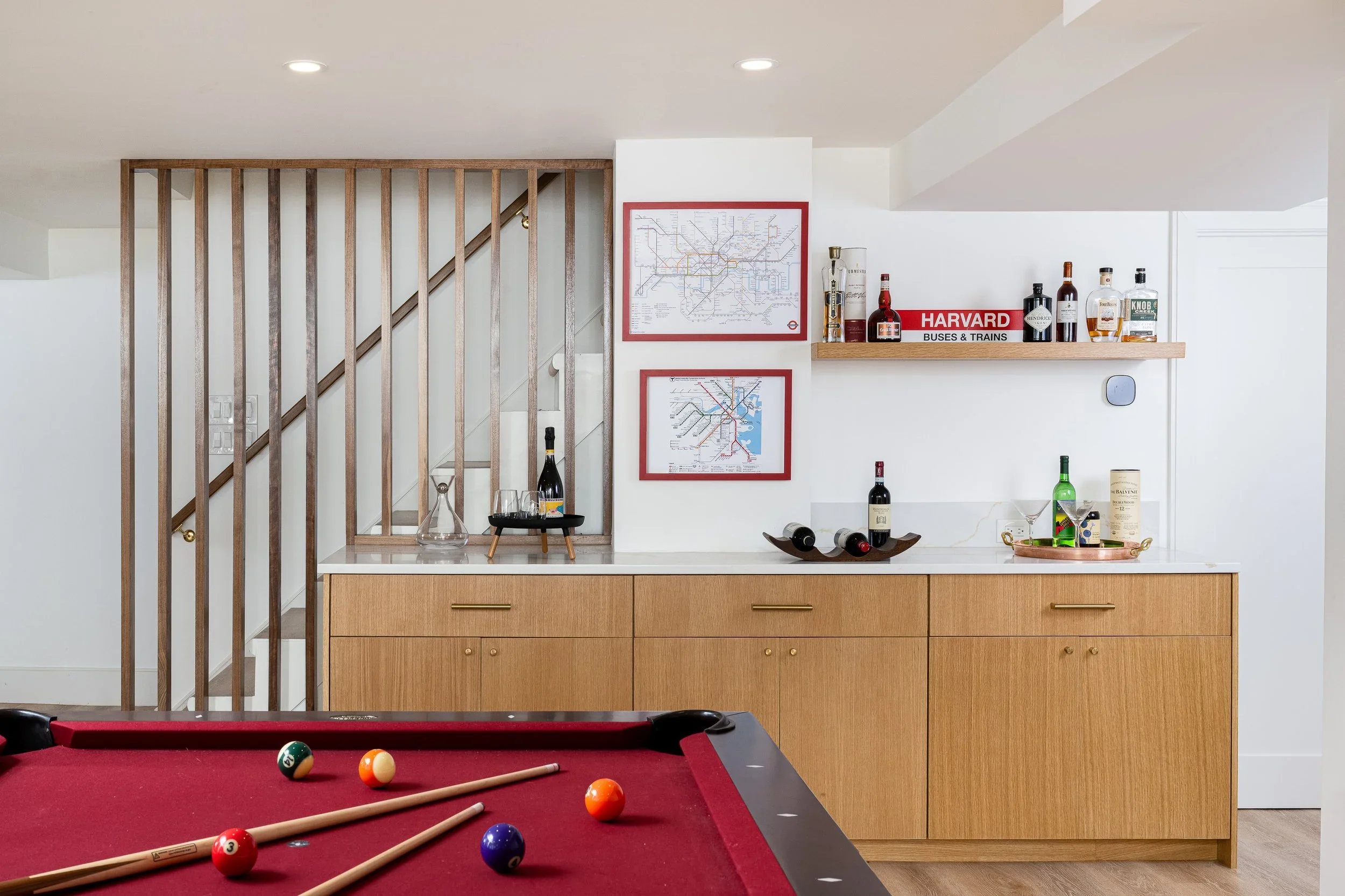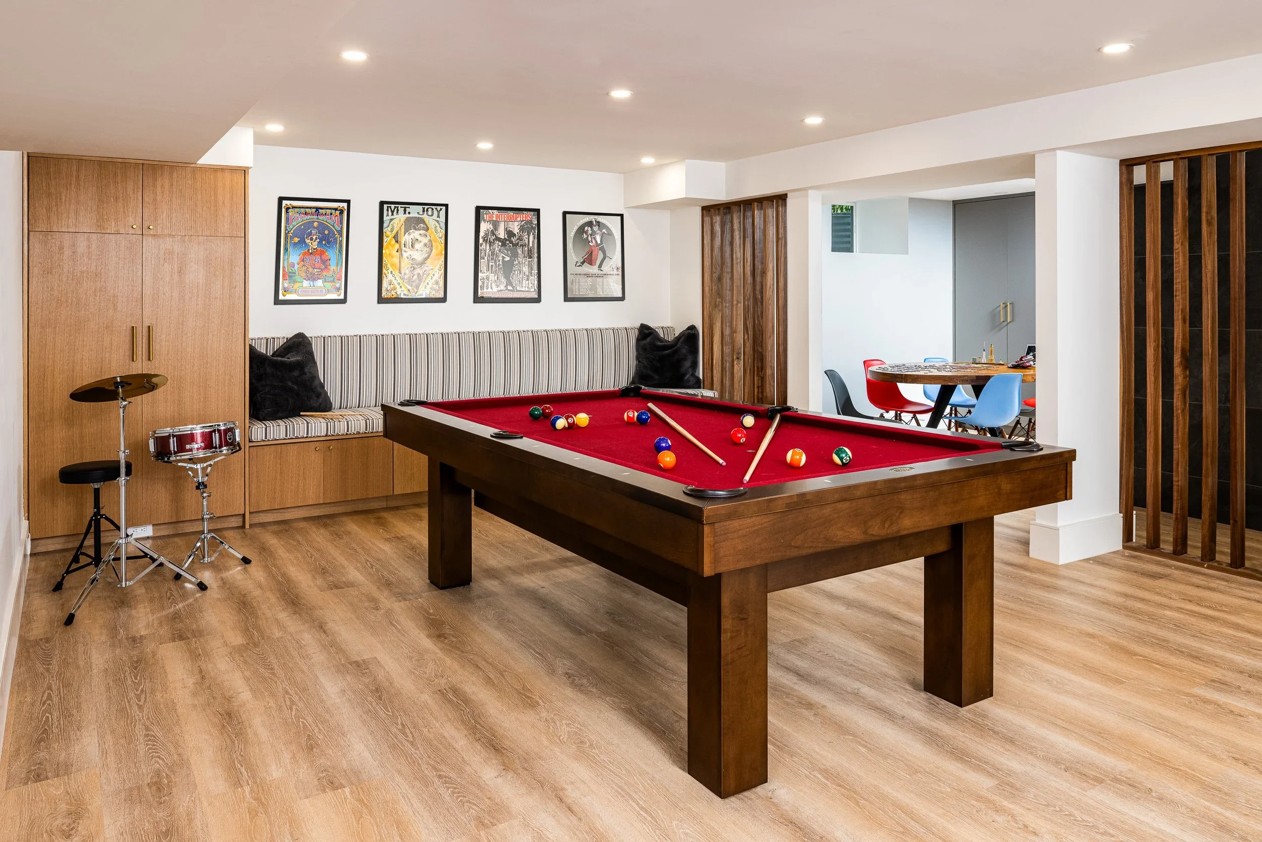 A complete transformation turned the once unfinished basement of this Victorian home into a Scandinavian-inspired recreational retreat. Clean lines and natural materials, create a bright and inviting atmosphere. The new layout features distinct zones, including a game space, movie lounge, pool table, bar, gym, half bath, and ample storage, offering both function and relaxation.