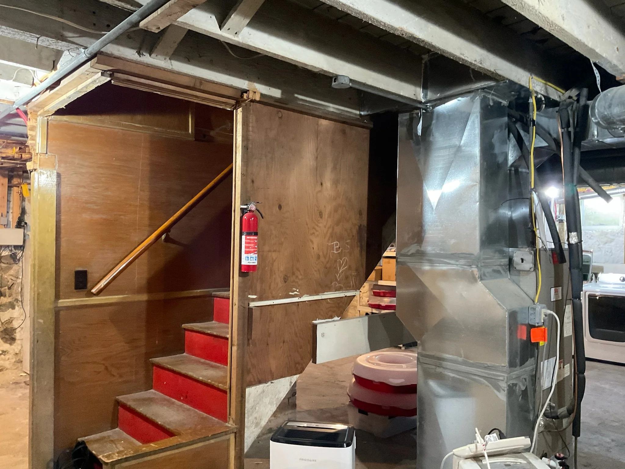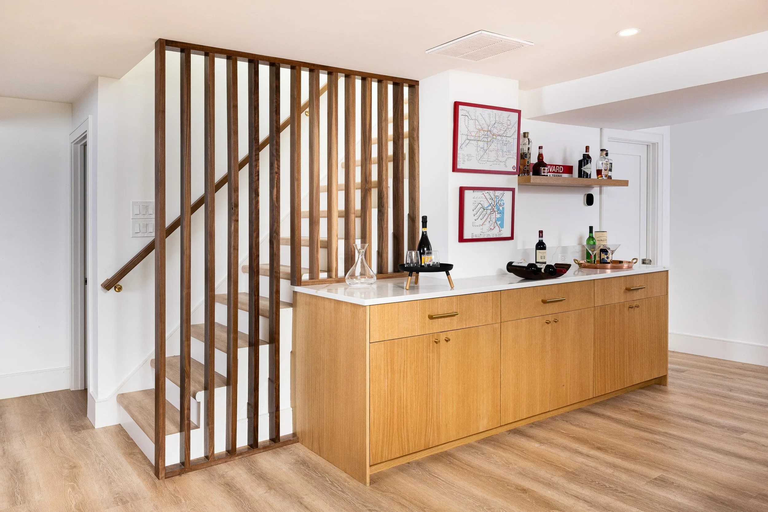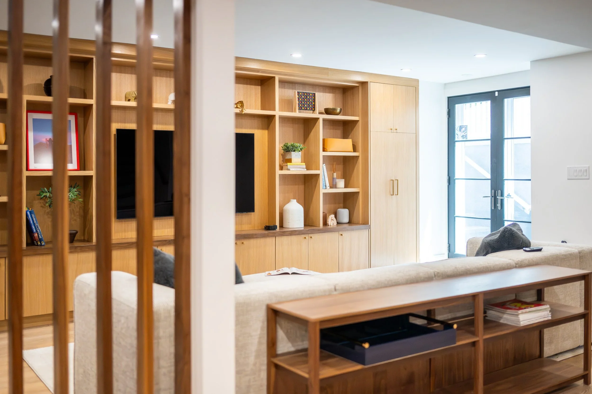 A complete transformation turned the once unfinished basement of this Victorian home into a Scandinavian-inspired recreational retreat. Clean lines and natural materials, create a bright and inviting atmosphere. The new layout features distinct zones, including a game space, movie lounge, pool table, bar, gym, half bath, and ample storage, offering both function and relaxation.