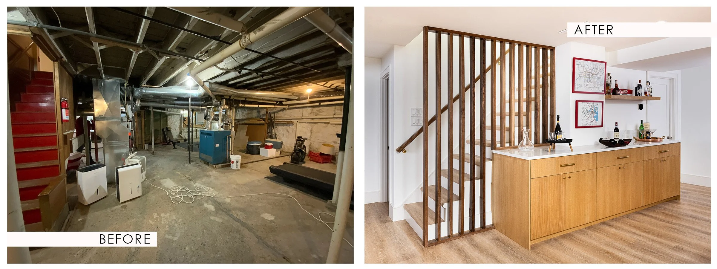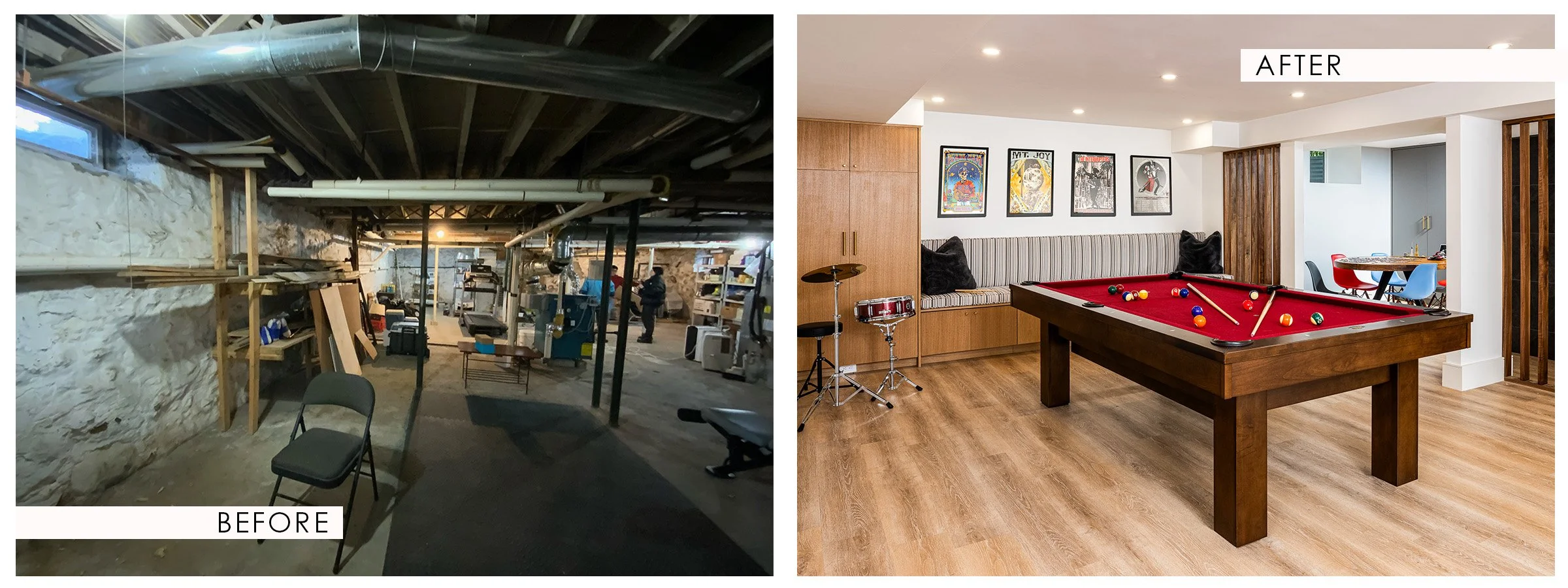 A complete transformation turned the once unfinished basement of this Victorian home into a Scandinavian-inspired recreational retreat. Clean lines and natural materials, create a bright and inviting atmosphere. The new layout features distinct zones, including a game space, movie lounge, pool table, bar, gym, half bath, and ample storage, offering both function and relaxation. Thoughtful lighting and finishes highlight the balance of modern comfort within a historic home. Beyond the basement, the renovation introduced a new two-car garage and an adjacent outdoor entertaining area with a spacious patio, extending the home’s lifestyle opportunities inside and out.