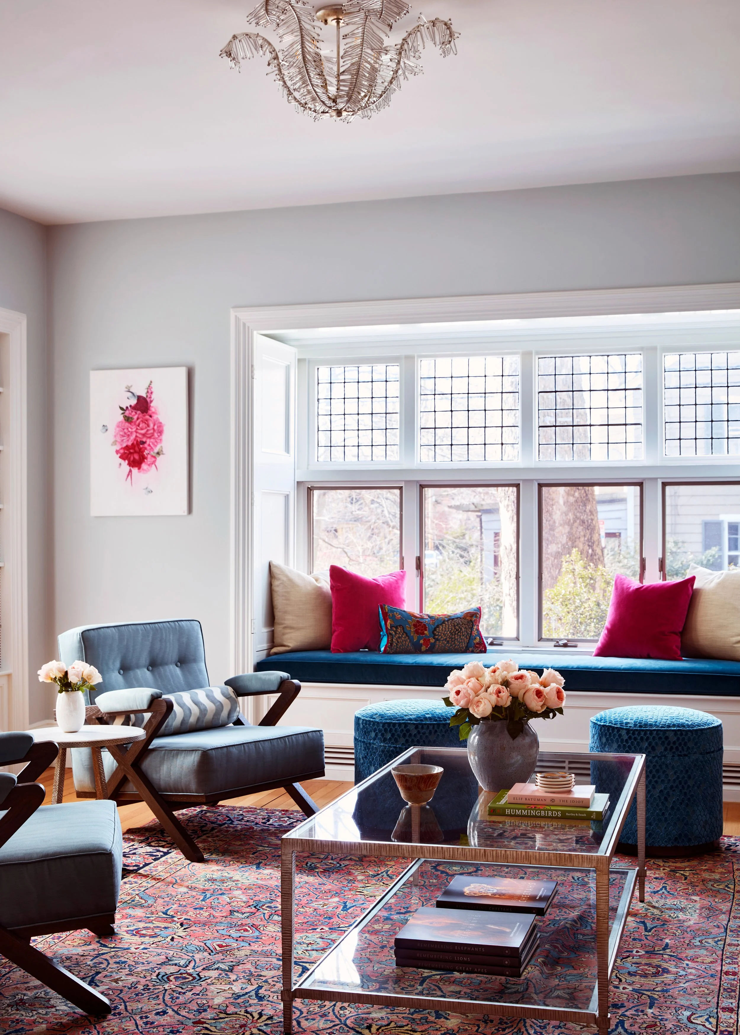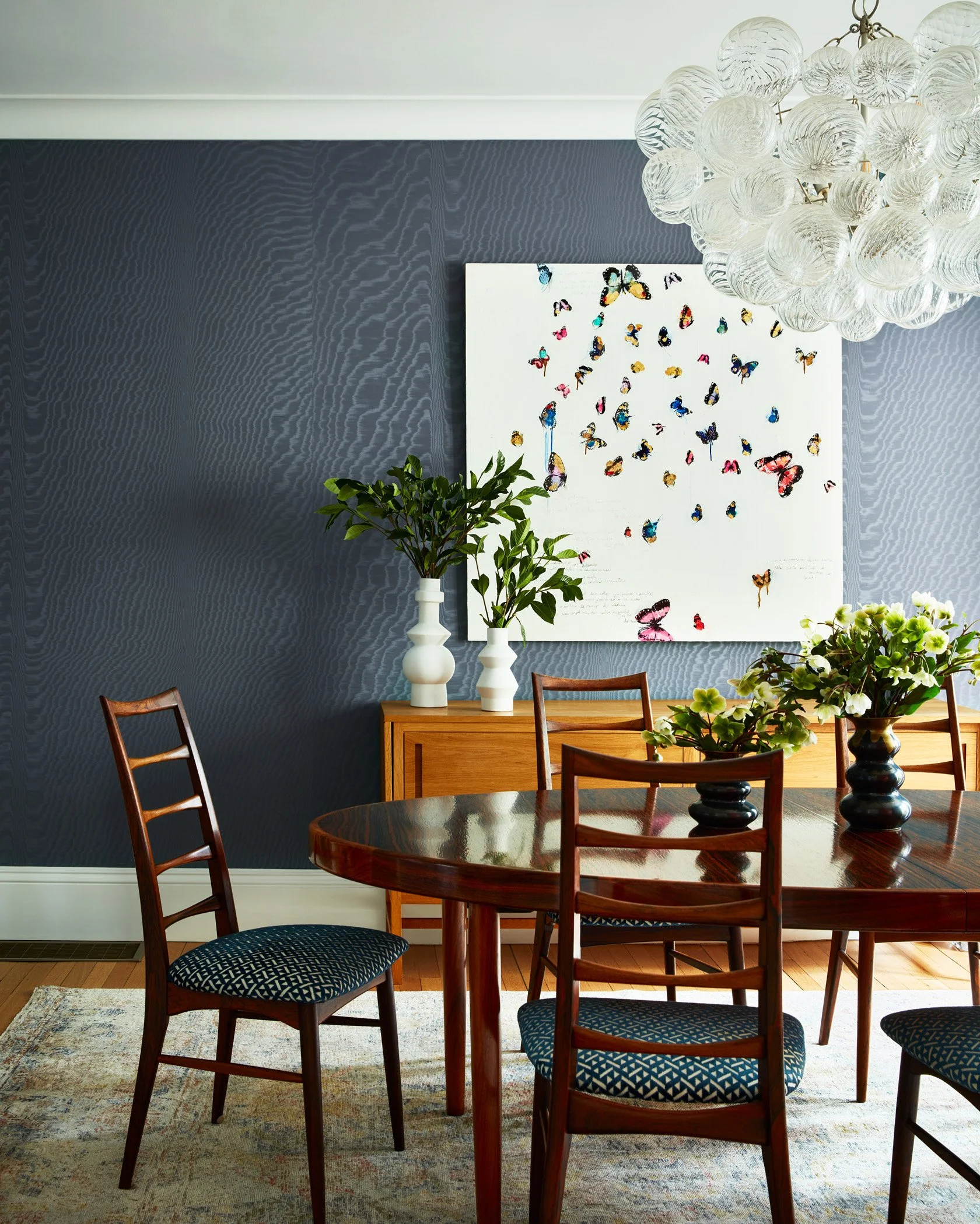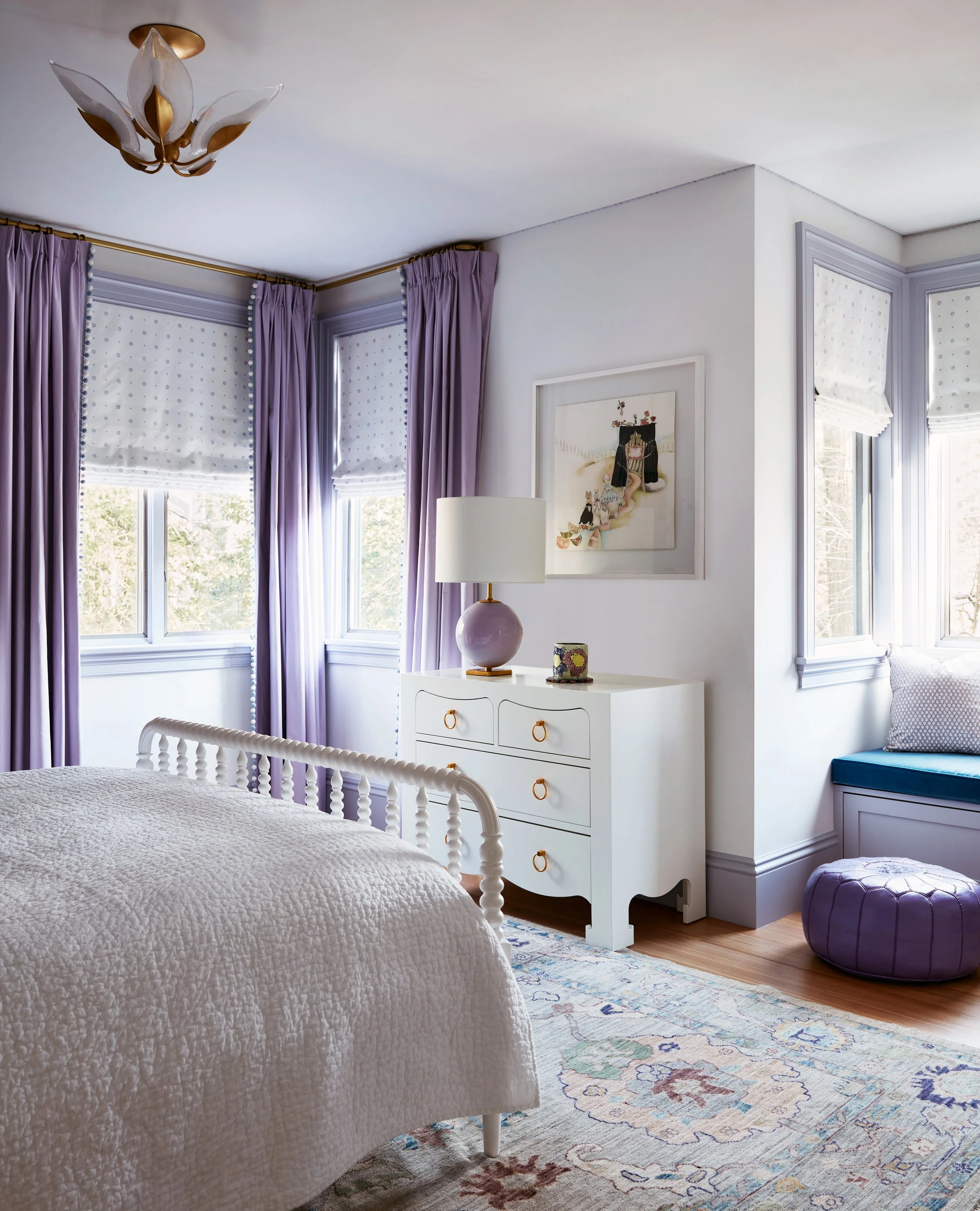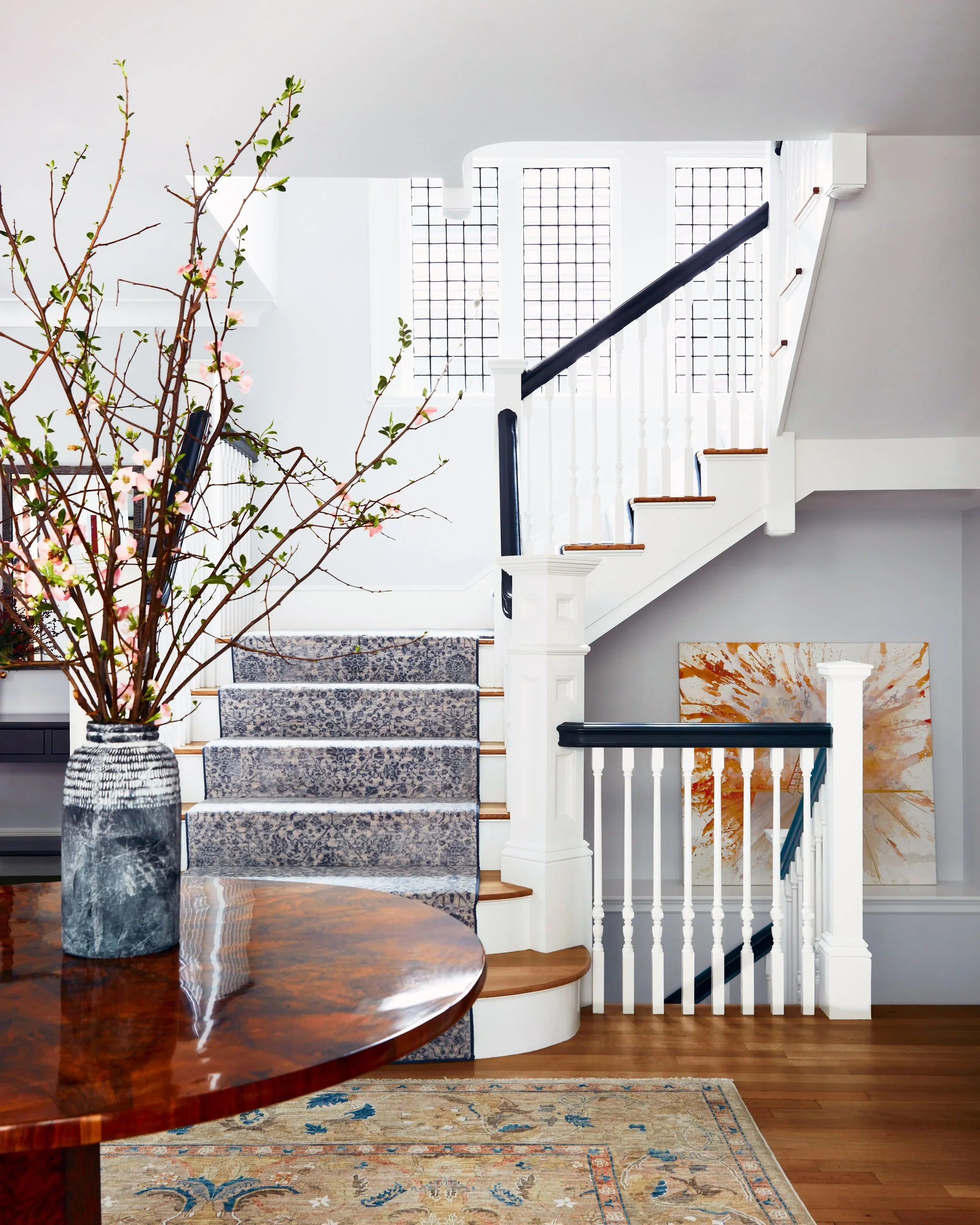 The design involved leaning into the existing features, like the four-story staircase and original window seats, and incorporating the clients’ extensive and colorful art collection. The renovation included the entry, kitchen, powder room, mudroom, second-floor bedrooms and ensuite bathrooms for the family’s two daughters, a home office, a third-floor primary suite, and a complete overhaul of the landscaping, with the addition of a plunge pool.