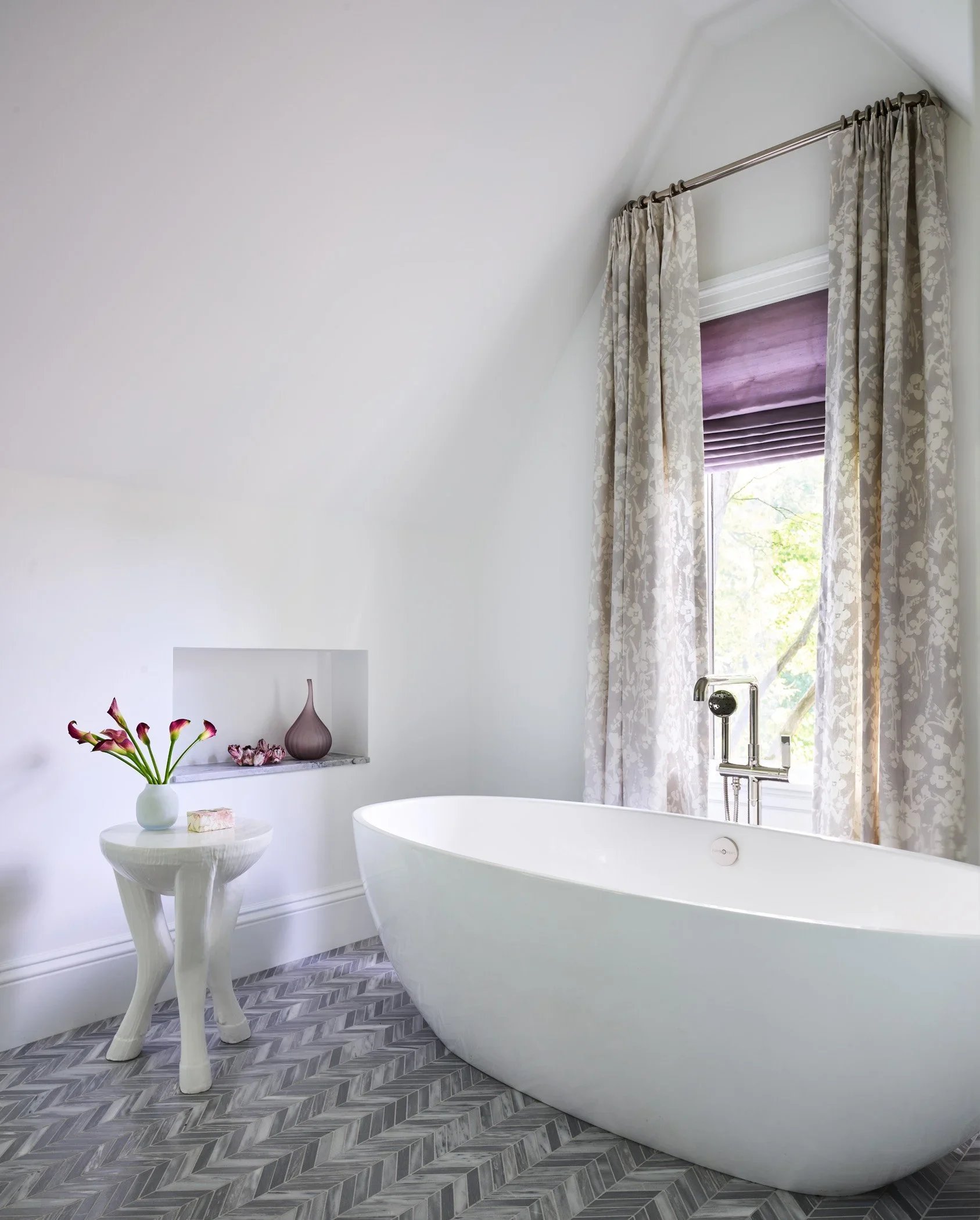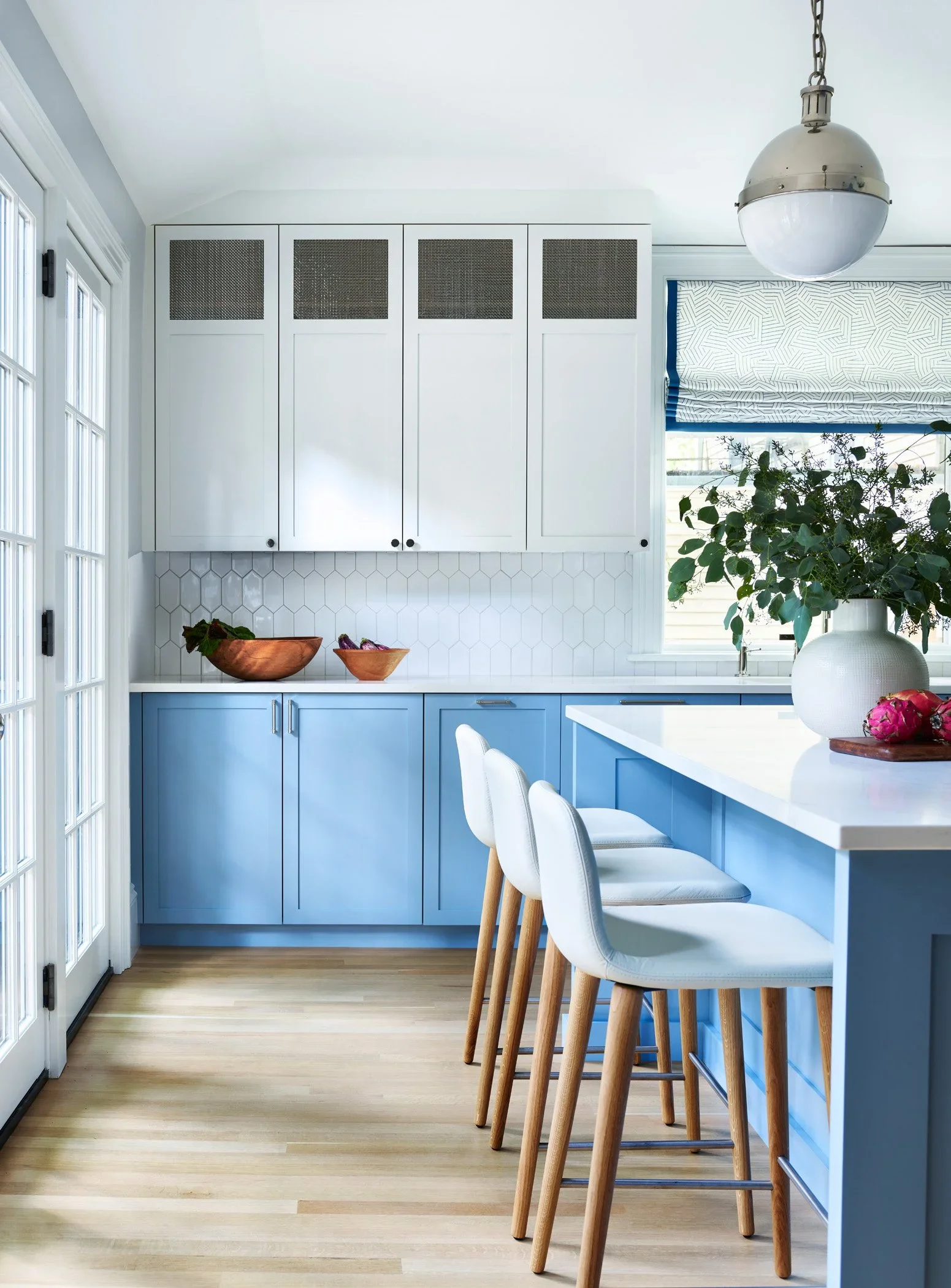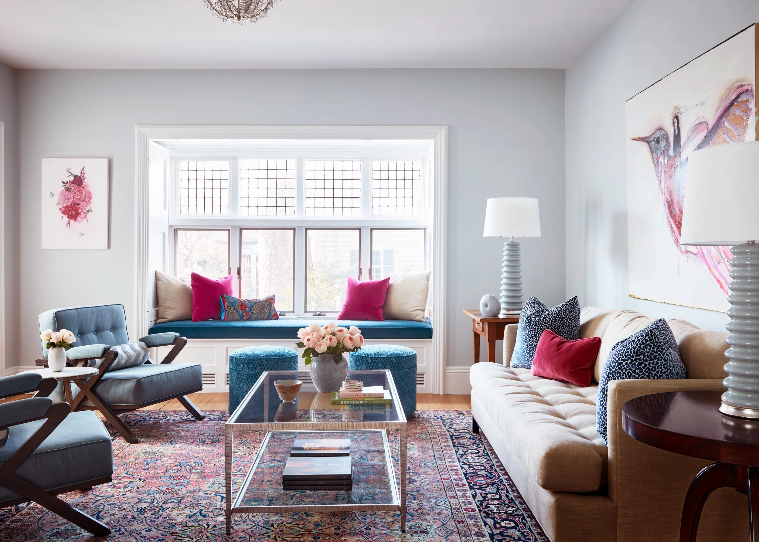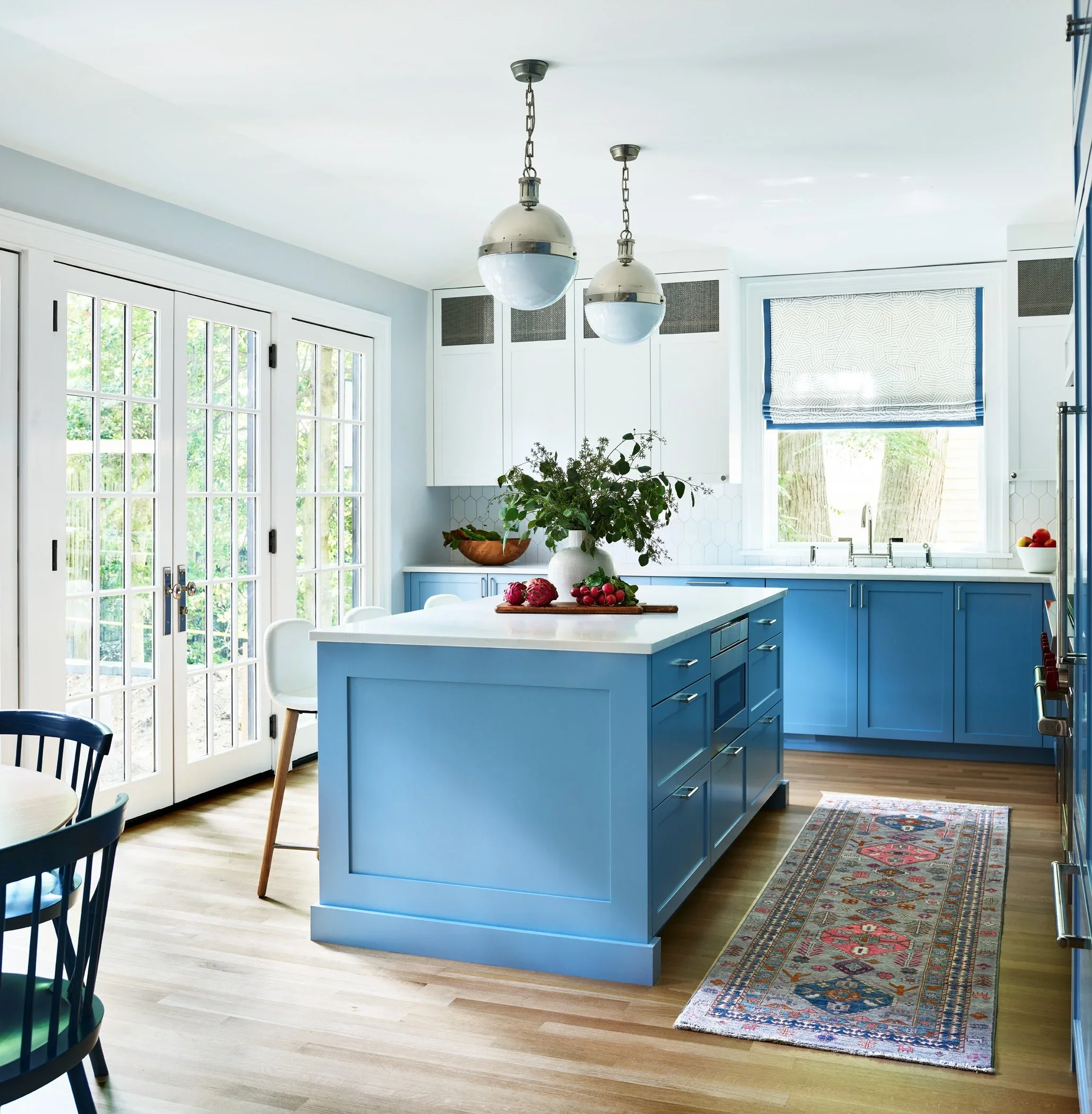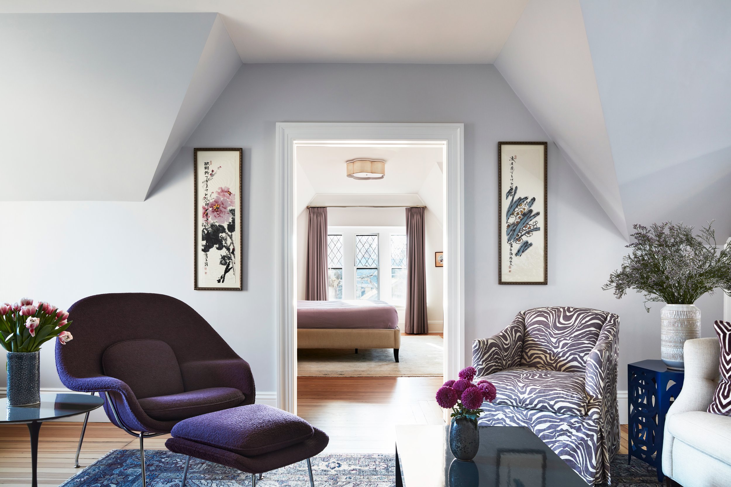 The design involved leaning into the existing features, like the four-story staircase and original window seats, and incorporating the clients’ extensive and colorful art collection. The renovation included the entry, kitchen, powder room, mudroom, second-floor bedrooms and ensuite bathrooms for the family’s two daughters, a home office, a third-floor primary suite, and a complete overhaul of the landscaping, with the addition of a plunge pool.