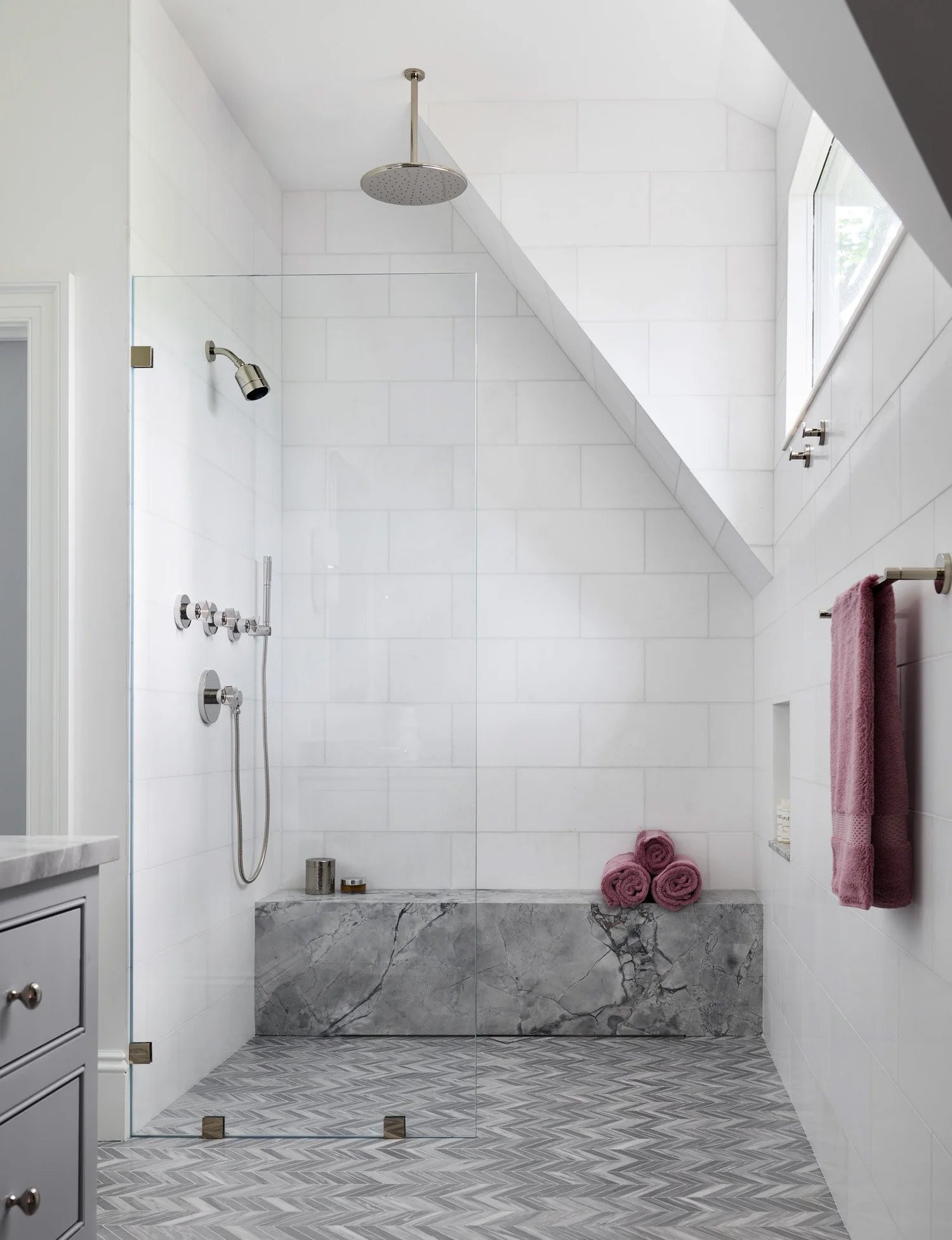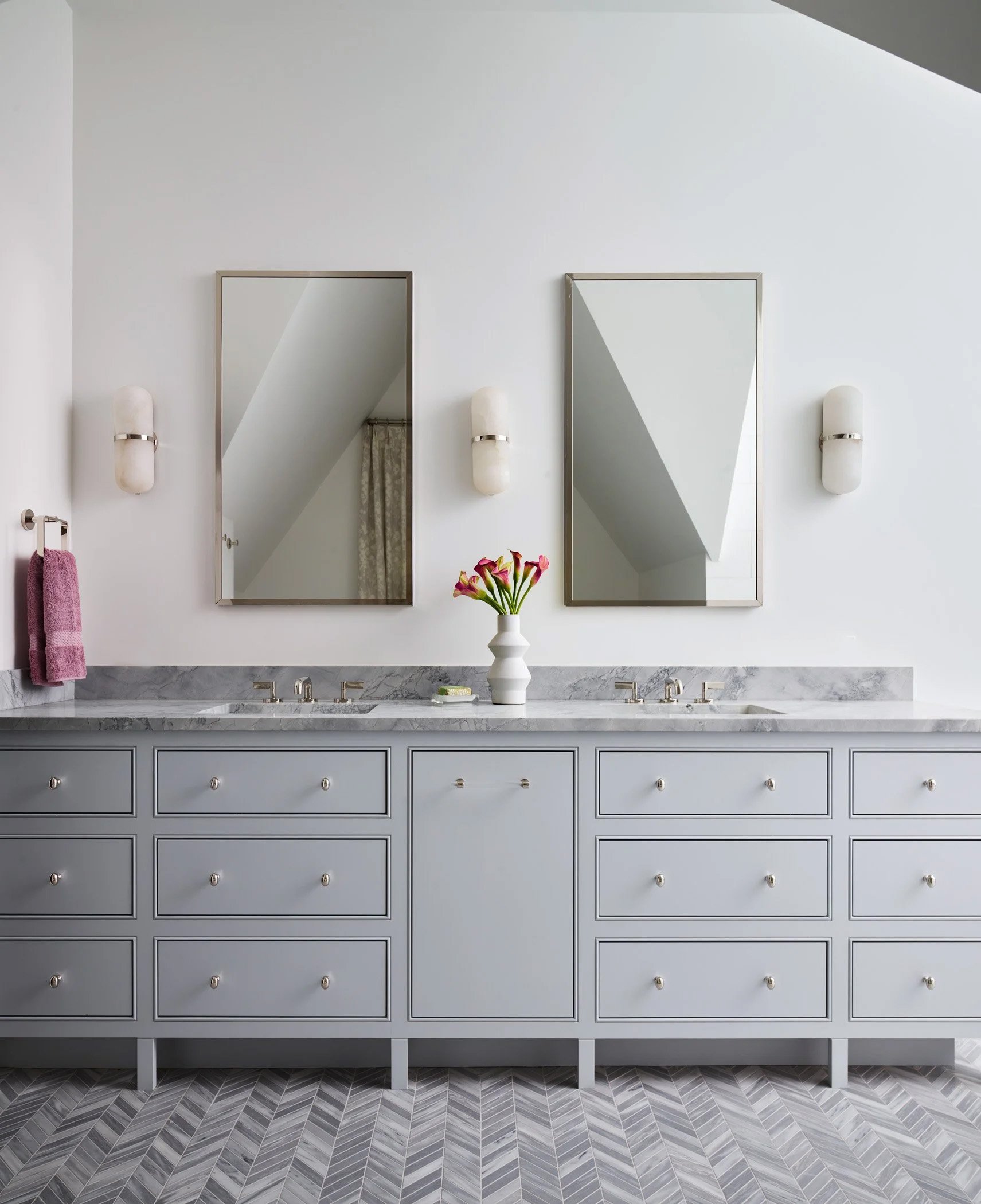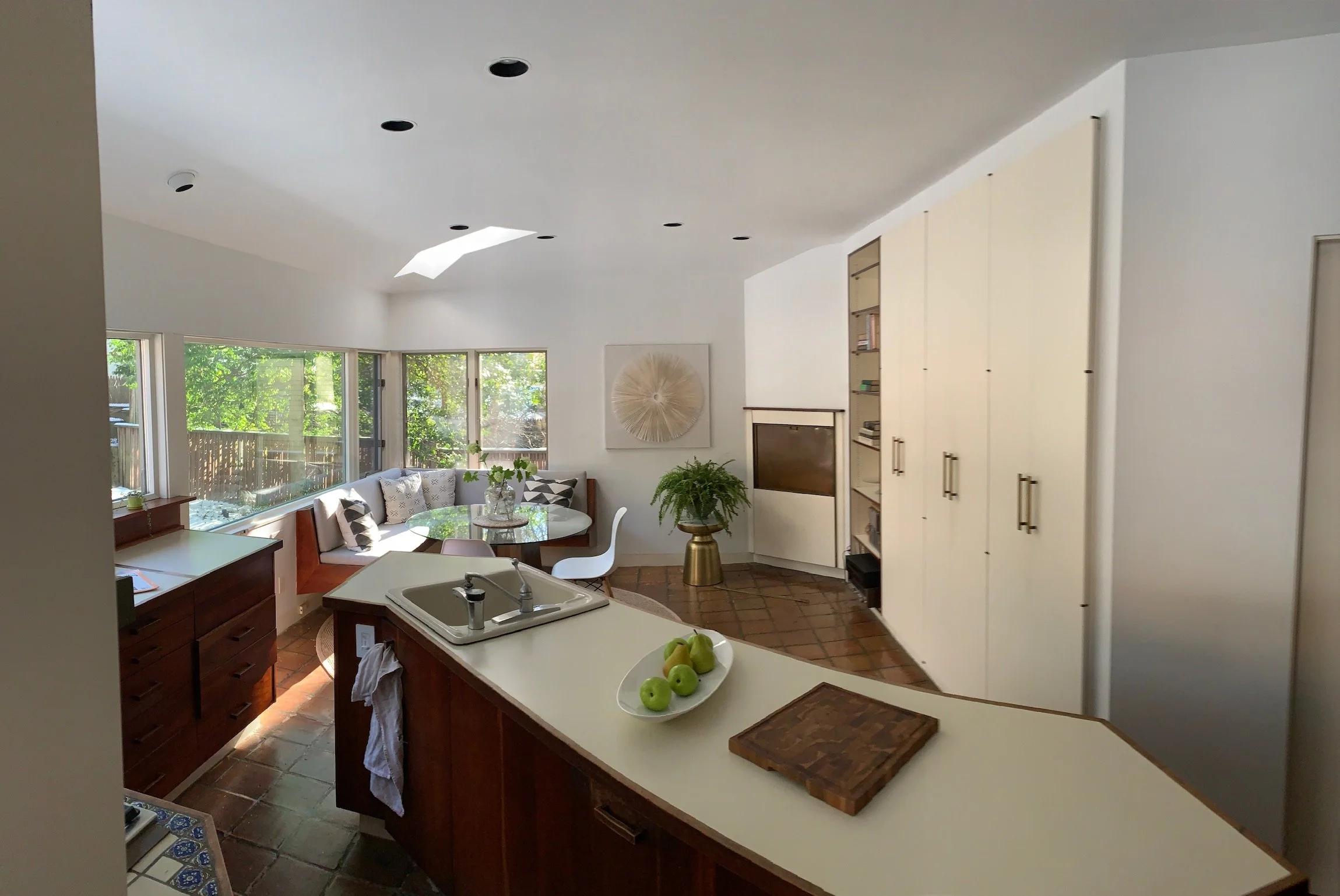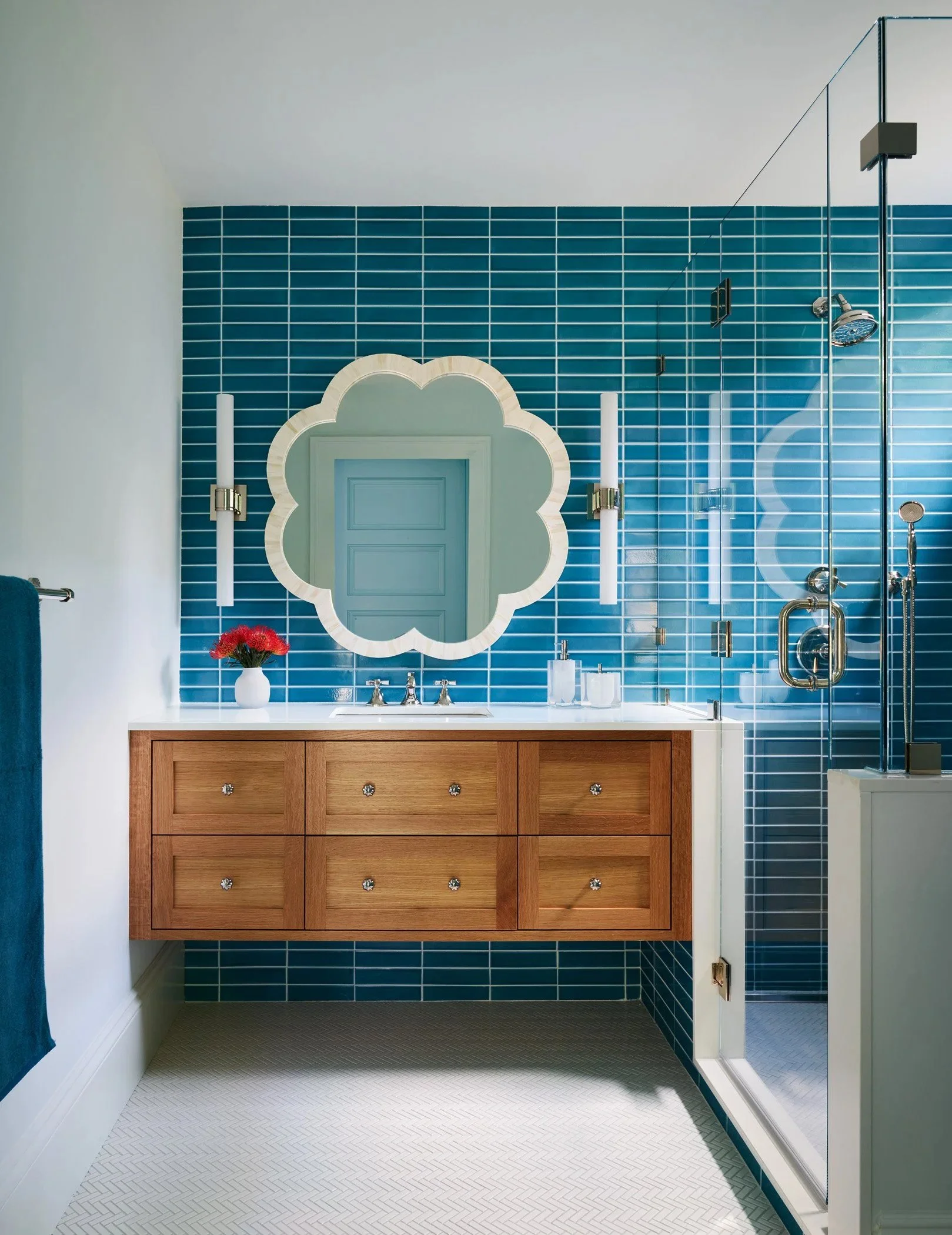The design involved leaning into the existing features, like the four-story staircase and original window seats, and incorporating the clients’ extensive and colorful art collection. The renovation included the entry, kitchen, powder room, mudroom, second-floor bedrooms and ensuite bathrooms for the family’s two daughters, a home office, a third-floor primary suite, and a complete overhaul of the landscaping, with the addition of a plunge pool.