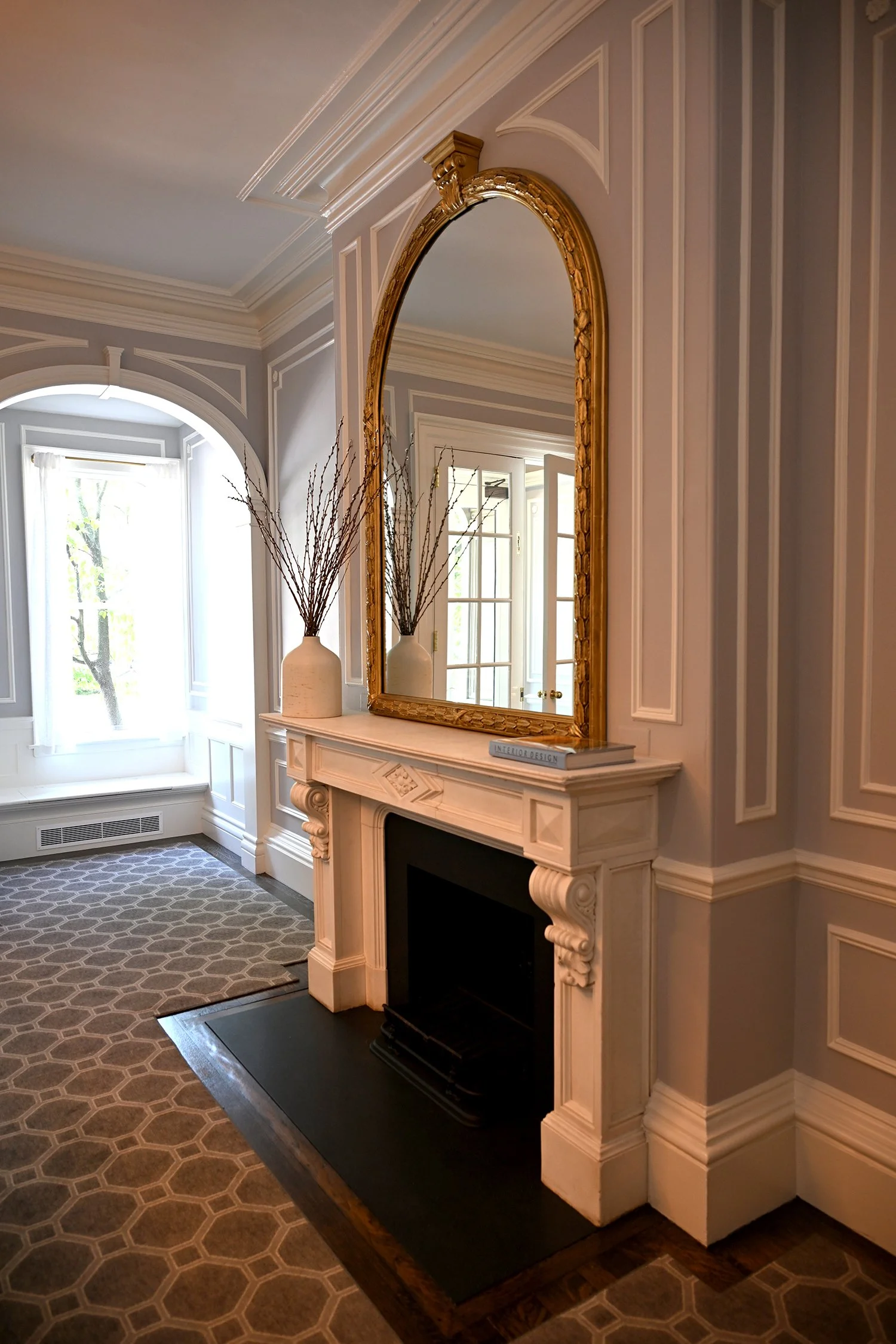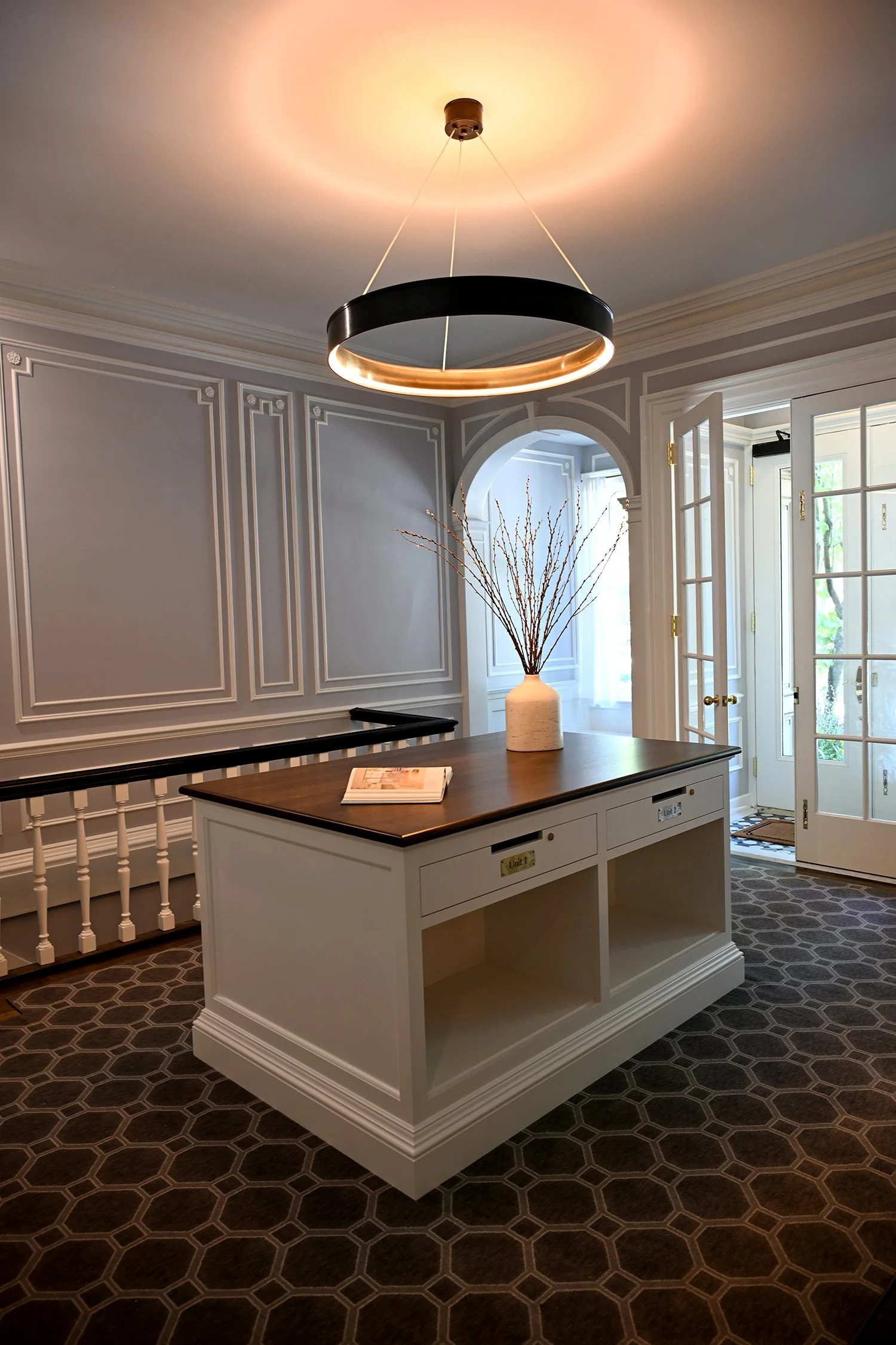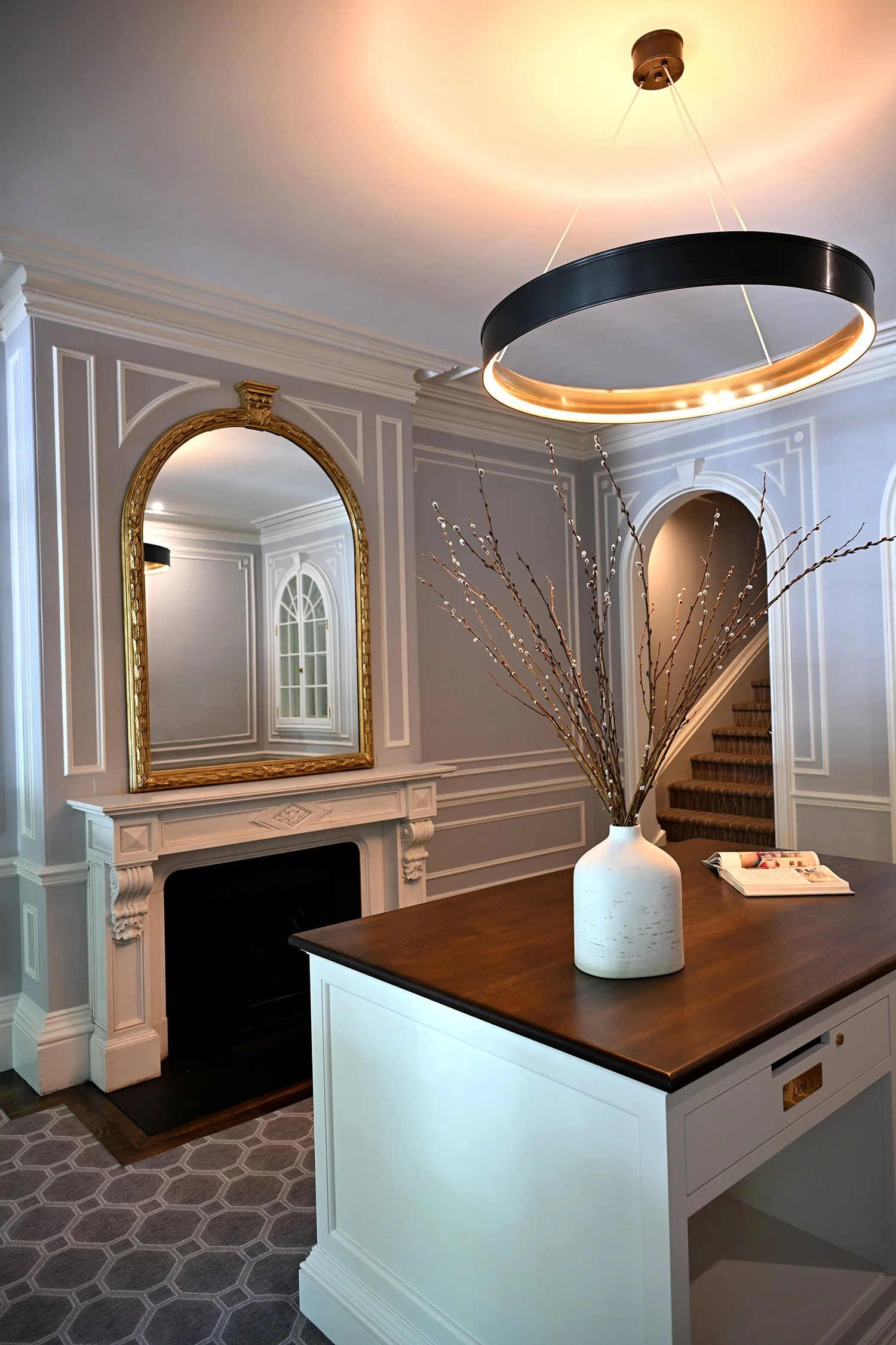 The largest design intervention was repairing the curved and detailed staircase, which needed to be shored up with additional steel supports. With the KCB team, we brought back the historical details throughout the space and aligned that restorative work with fresh, modern lighting and details. The custom-built mail station from KCB is a functional and beautiful new addition for these residents.