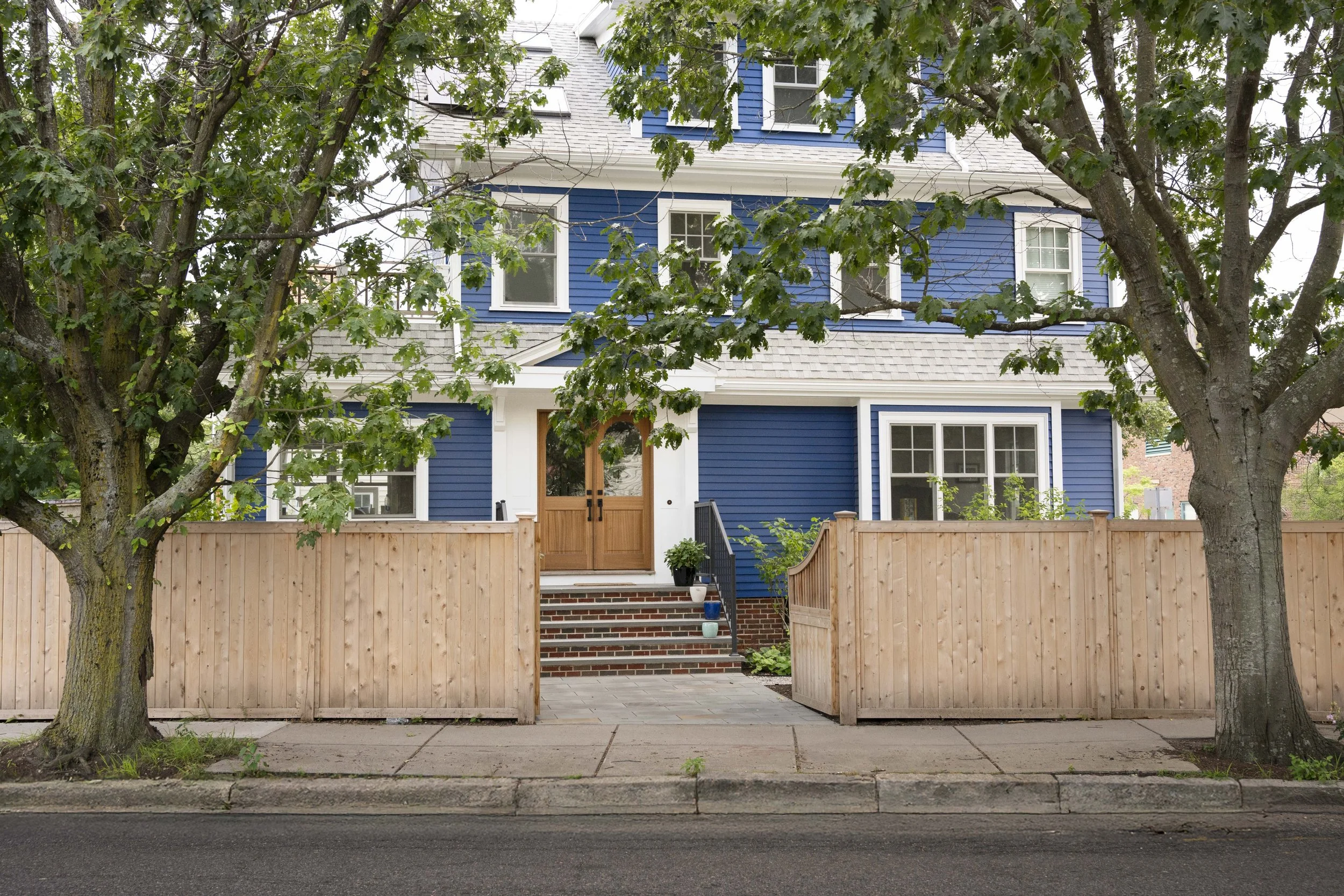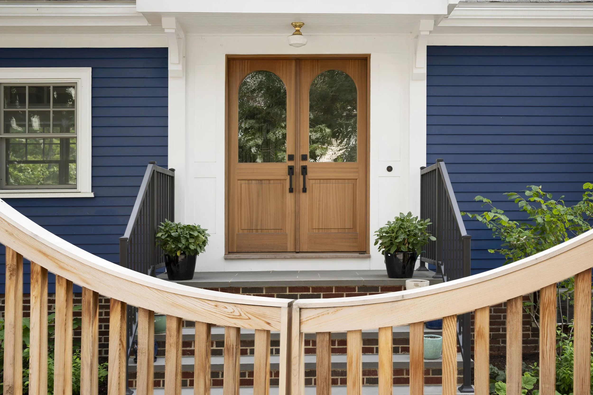 The second floor was reimagined to include three bedrooms, a full bath, and a versatile office, while the first floor now features a welcoming mudroom, open living and dining areas, and a spacious kitchen designed for family life. The former garage was removed to make way for a landscaped yard and side-by-side driveway, complemented by new fencing and plantings that frame the home beautifully. At the entry, custom double curved front doors add a distinctive architectural touch, setting the tone for a residence that is both fresh and timeless.