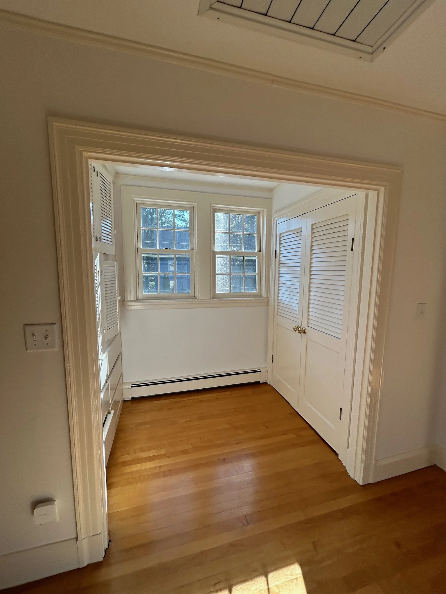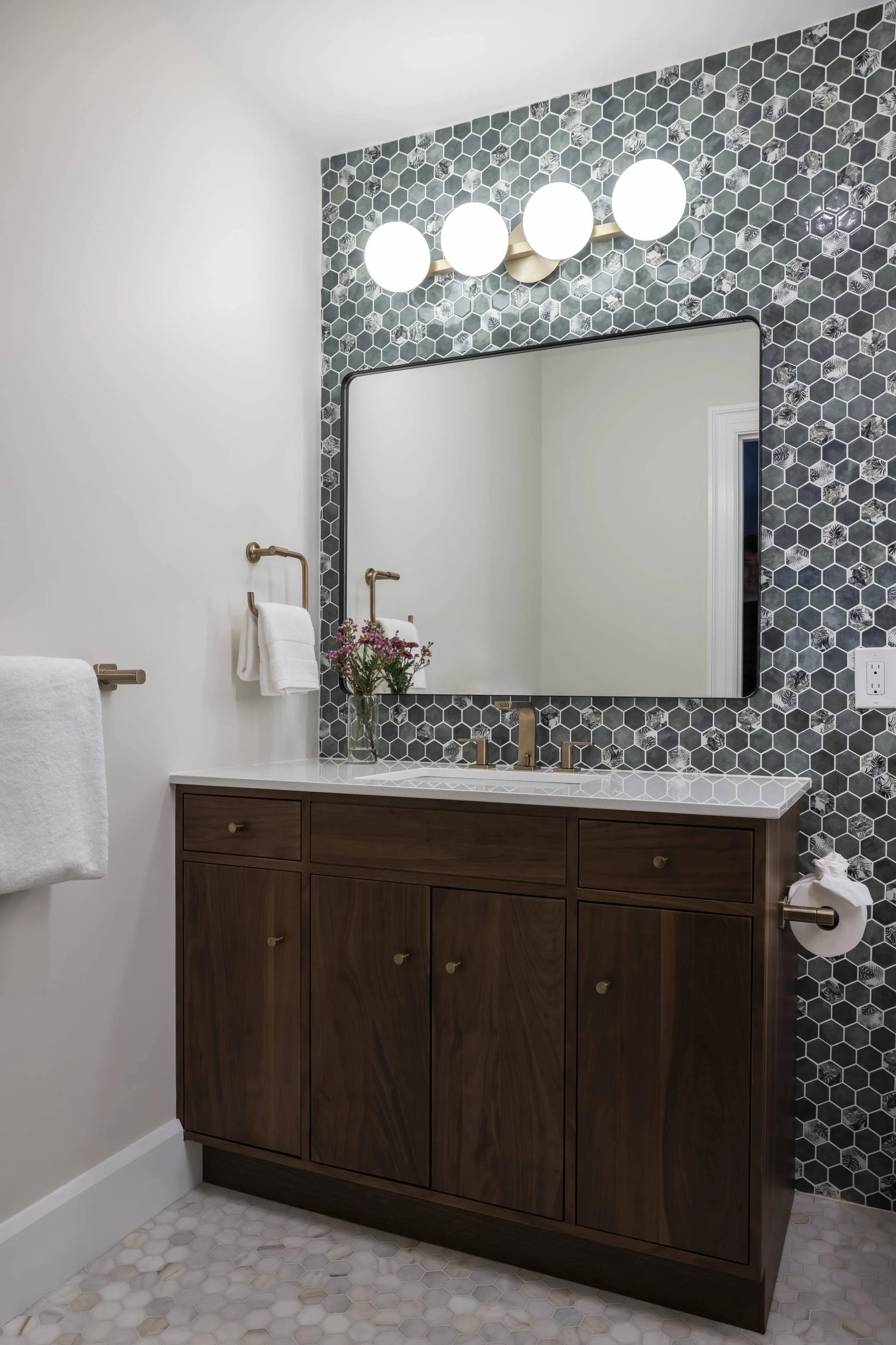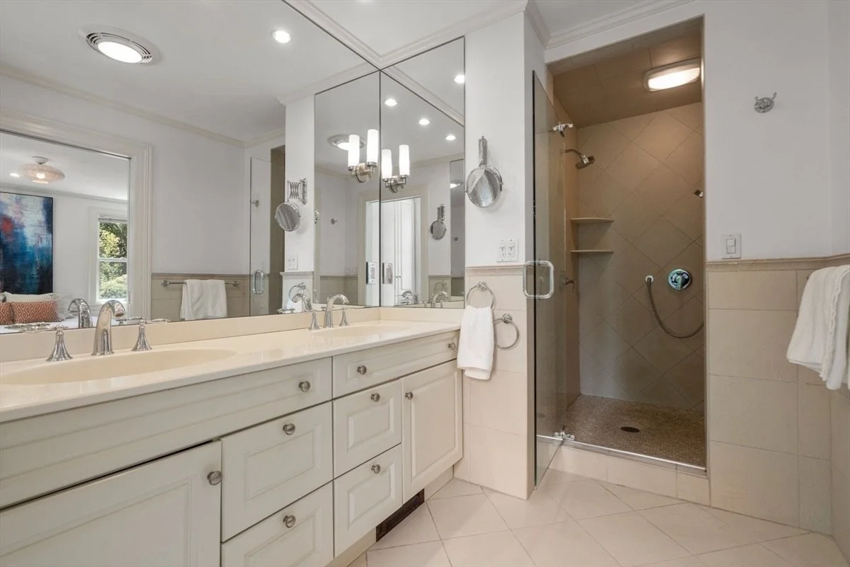 The goal with this project was, primarily, to reorganize the second level with a more functional layout. We opened up the staircase and replaced a storage area with a large laundry space, separated by pocket doors that allow light to permeate the hall. The primary bedroom was rearranged to enlarge the bathroom and reorganize the closet. A large shower room with dual shower heads and soaking tub were added, along with a new double vanity and mirrors with integrated lighting. In the primary closet, built-in dressers with small drawers were replaced with expansive hangers, shoe racks, and larger drawers.