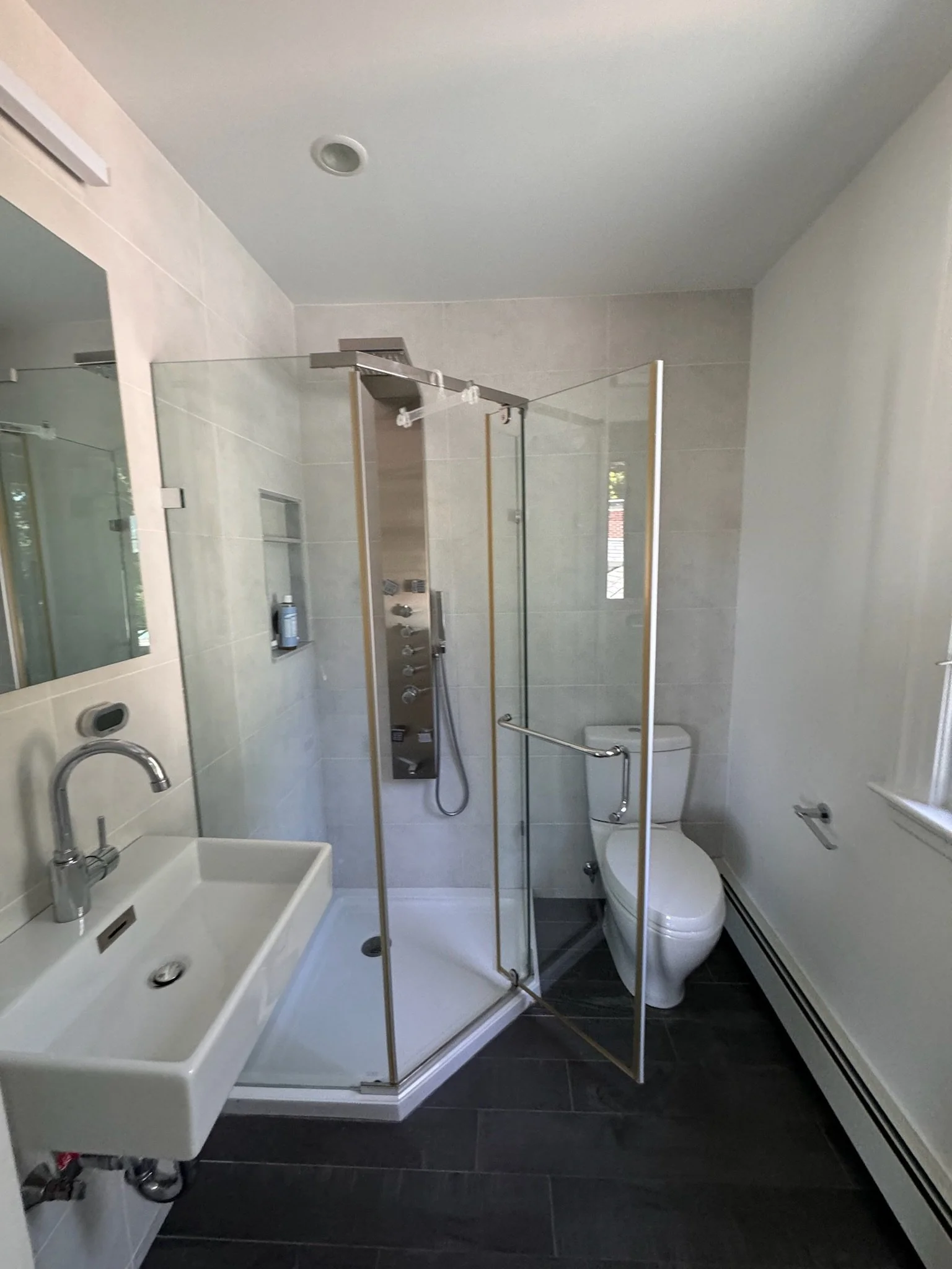 The guest suite was refreshed completely, with a new tiled shower and updated fixtures. At the main level, the sitting room was divided into two spaces to create a light and bright office. The dining room and living spaces were refreshed with new paint and some modifications to built-in storage. Finally, a gym space was refreshed at the lower level.